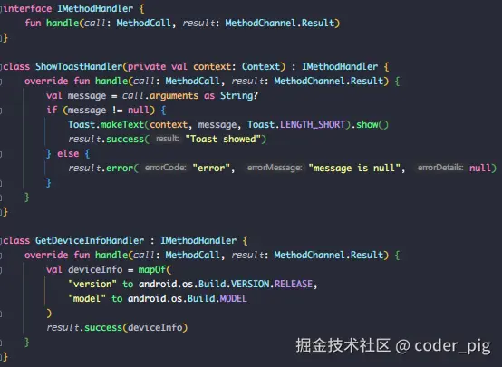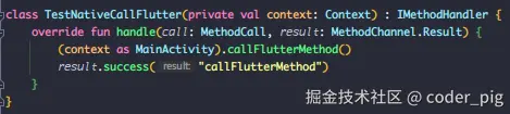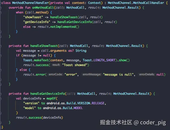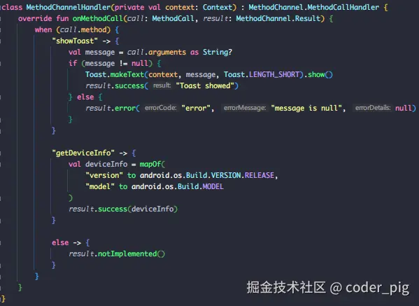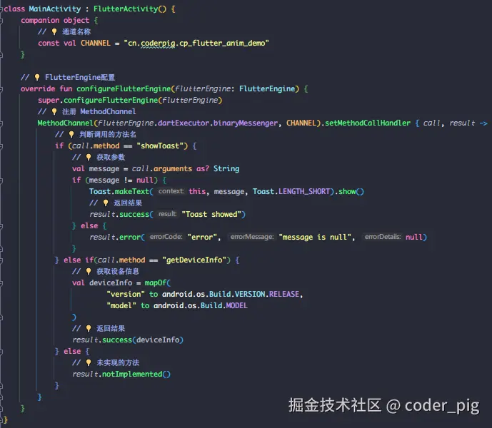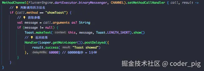 - ② Android 端:继承 FlutterActivity,重写 configureFlutterEngine() 在其中注册 MethodChannel,对调用的方法名进行判断,读取 参数 执行相关操作,然后通过 result.success() 返回结果给Flutter端。