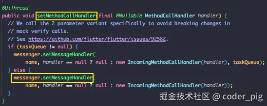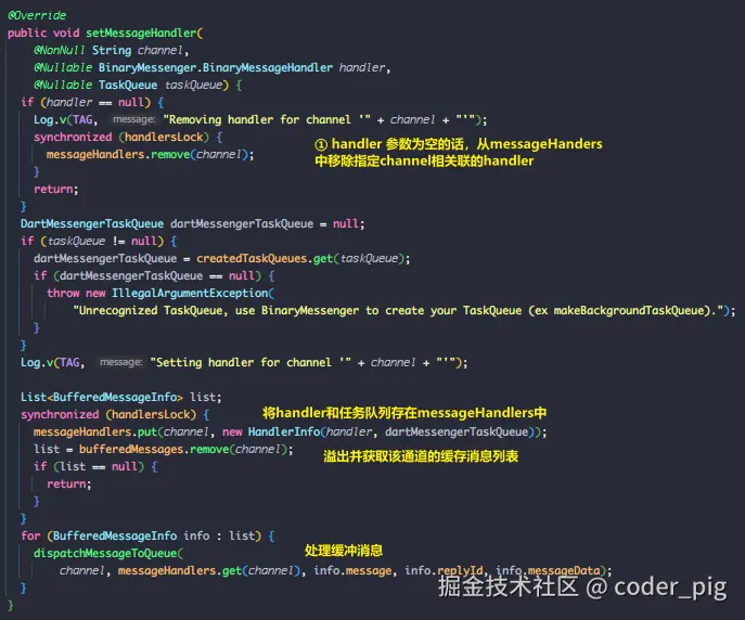 本质上调用的 DefaultBinaryMessenger#setMessageHandler() 。