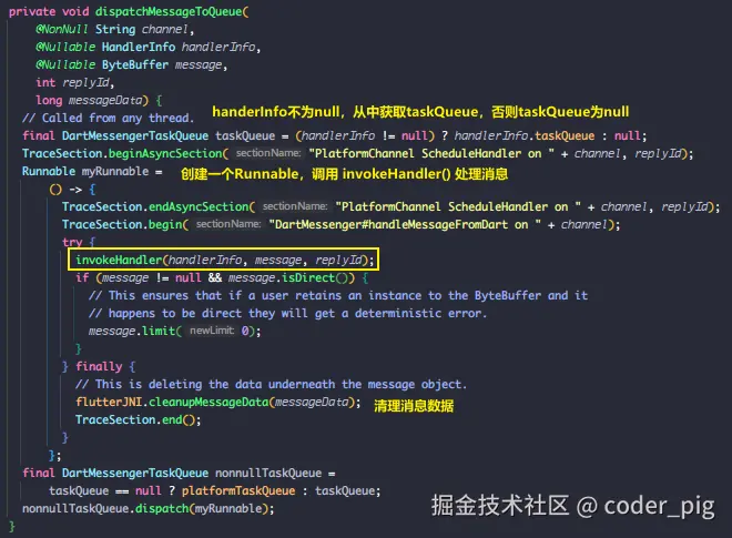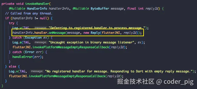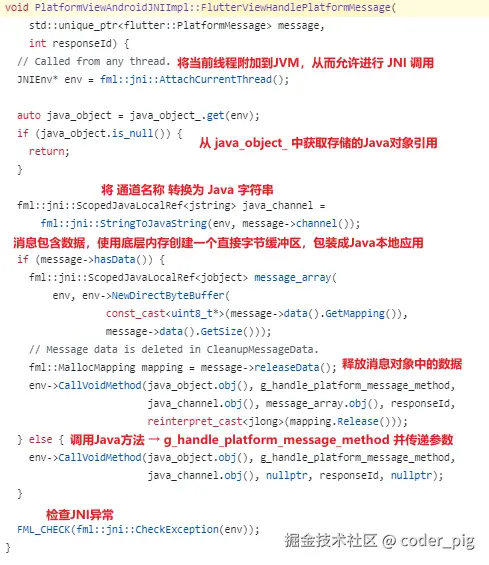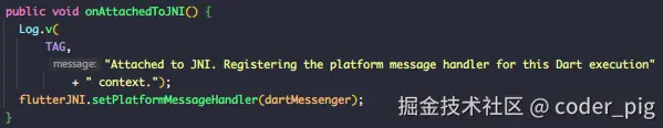 🤷♀️ 行吧,最终调用的 Java 层的 FlutterJNI.java 里的 handlePlatformMessage() ,🤿 跟完 Engine层,接着再来看下 Embedder层-Android的相关实现。