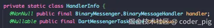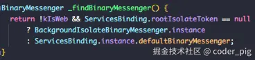 🤔 判断是否为 Web环境 且 ServicesBinding.rootIsolateToken 为 null (当前处于main isolate),是-返回 BackgroundIsolateBinaryMessenger.instance 否-返回ServicesBinding.instance.defaultBinaryMessenger。我们通信的平台是 移动端,所以只关注后者。