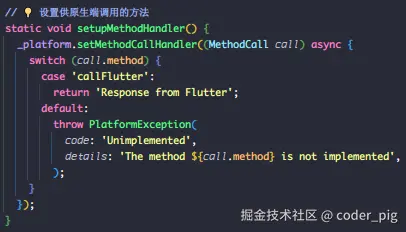 Flutter端 一般很少直接把MethodChannel相关的代码写在 UI层,而是抽取到一个单独的 服务类 中,方便 复用 和 维护。然后是常规需要捕获的 两个异常:
