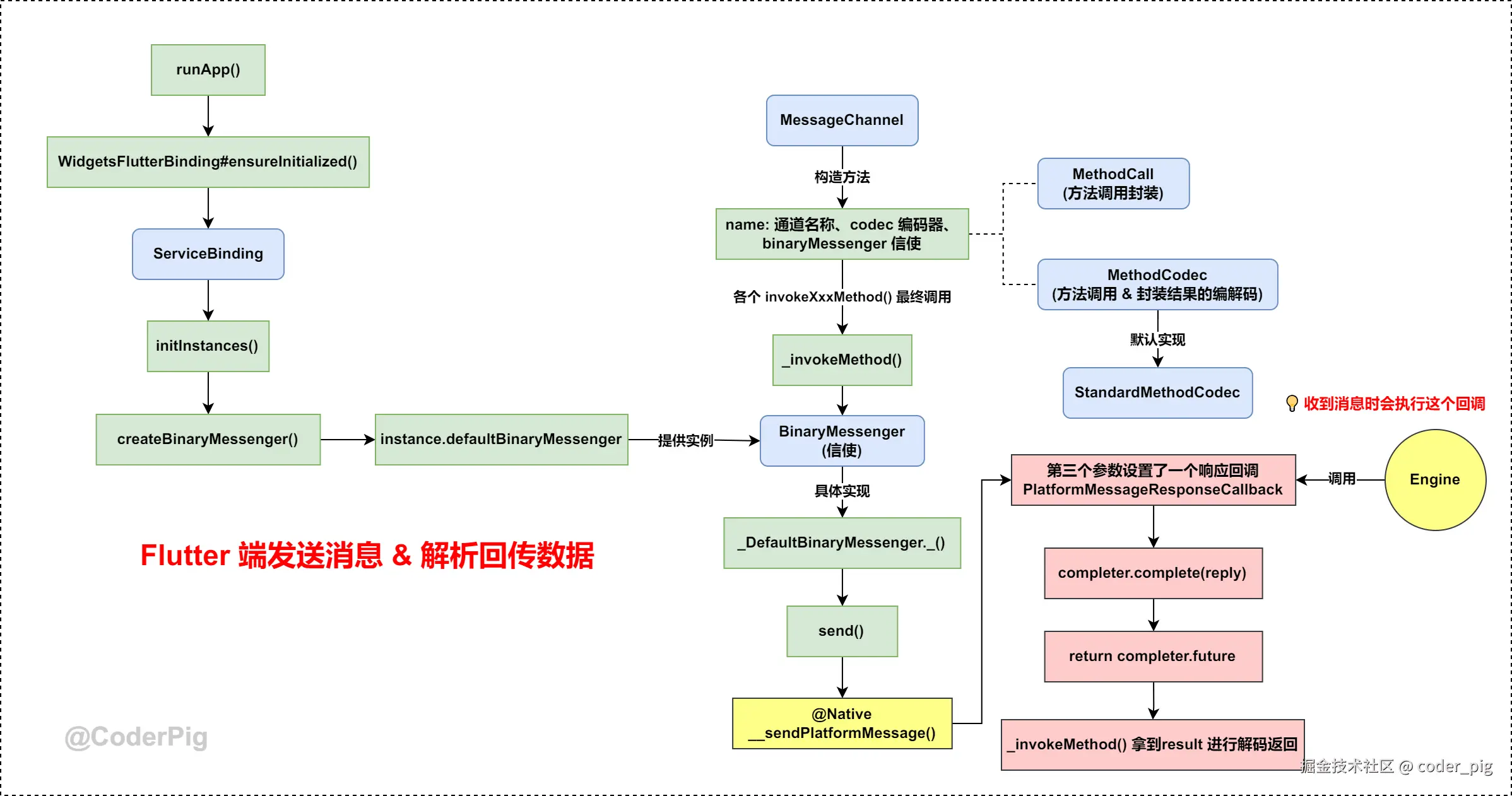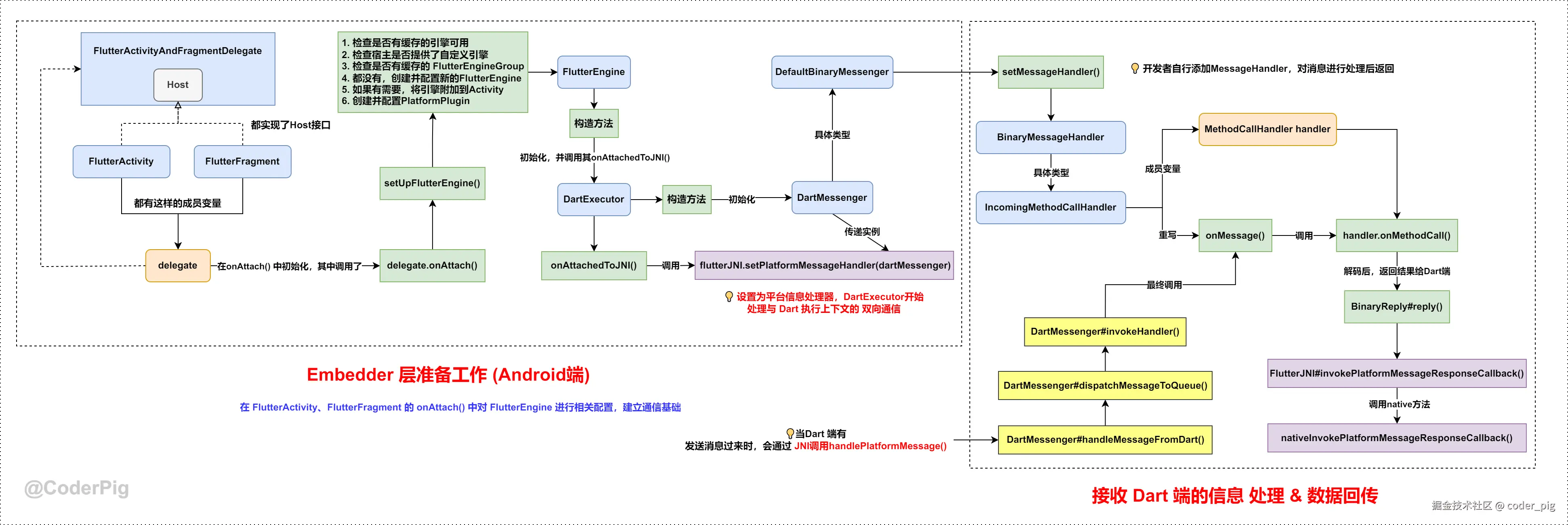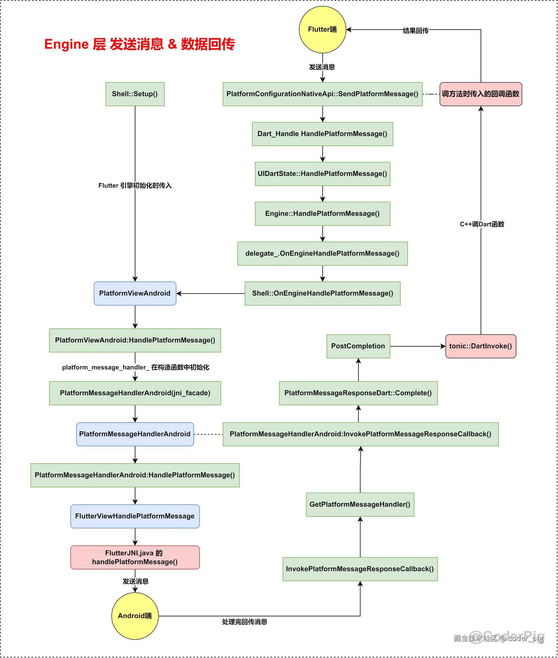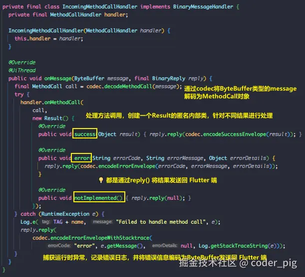 👏 到此,我们总算把 从Dart端发送消息 → Android端,Android端处理后回传结果 → Dart端 的代码调用流程走通了。😄 接着画下图,帮助大家缕清整个调用流程~
