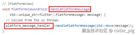 🤔 em... 再搜下 FlutterViewHandlePlatformMessage,路径:shell/platform/android/platform_view_android_jni_impl.cc: