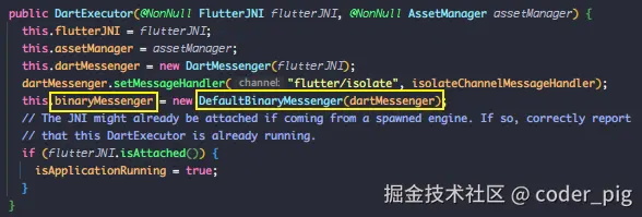 这里调用 setPlatformMessageHandler() 将 dartMessenger 设置为 平台消息处理器,这使得 DartExecutor开始处理与 Dart执行上下文 的 双向通信。而 binaryMessenger 也是在 DartExecutor 的构造方法中进行的初始化: