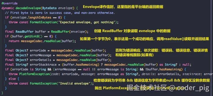 🤔 em... 就是将 Dart对象序列化 并 写入到WriteBuffer 中,这是 编码,也看下 解码 → decodeEnvelope() :