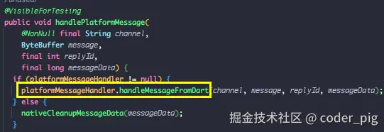 根据前面的代码,我们可以知道这个 platformMessageHandler 其实就是 DartMessenger,跟下它的 handleMessageFromDart() :
