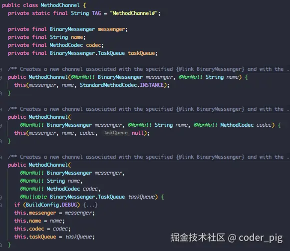 参数和上面 Dart 的 MethodChannel 基本一致,多了个 taskQueue,关注点在 BinaryMessenger(信使) 上,Demo 中通过重写 FlutterActivity 的 configFlutterEngine() ,调用 flutterEngine.getDartExecutor().getBinaryMessenger() 拿到 BinaryMessenger实例,然后创建了 MethodChannel。