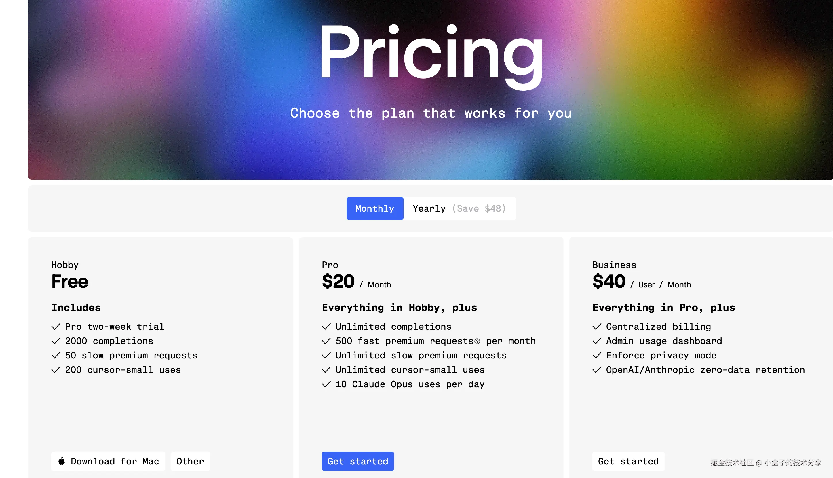 然后就是价格,cursor 前两周是免费使用的,然后再用就要收费了,怎么收费呢?