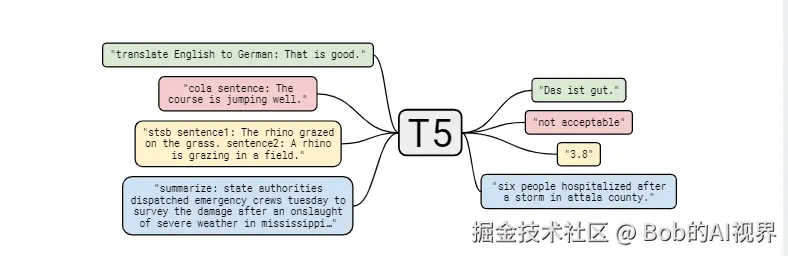 - 迁移学习:T5的预训练涵盖了大量的任务,这使它在迁移到新任务时具有较好的表现。