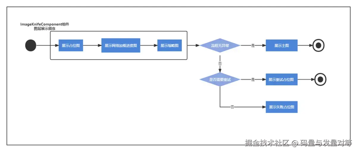 大致流程 展示占位图->展示网络加载进度->展示缩略图->展示主图->展示重试图层->展示失败占位图