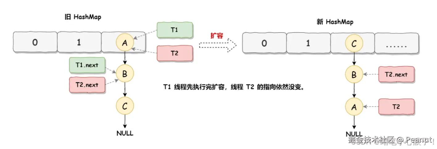 说说 t1执行完扩容之后指针发生了改变,t2被唤醒此时链表已经倒置,然后t2执行操作导致死循环。