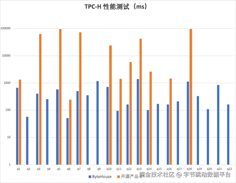 在此前发布的性能白皮书中,ByteHouse通过SSB、TPC-H 和 TPC-DS三种数据集测试结果展示了其性能硬实力。以性能著称的某开源OLAP作为基准测试产品,ByteHouse在不同查询项上都有显著的性能提升。以TPC-H 数据集举例,在相同硬件和软件环境下, ByteHouse 查询效率高于本次基准测试产品几十倍。