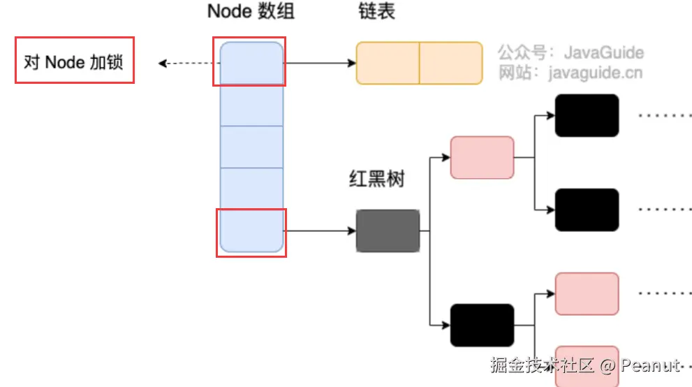 Java 8 中,锁粒度更细,synchronized 只锁定当前链表或红黑二叉树的首节点,这样只要 hash 不冲突,就不会产生并发。