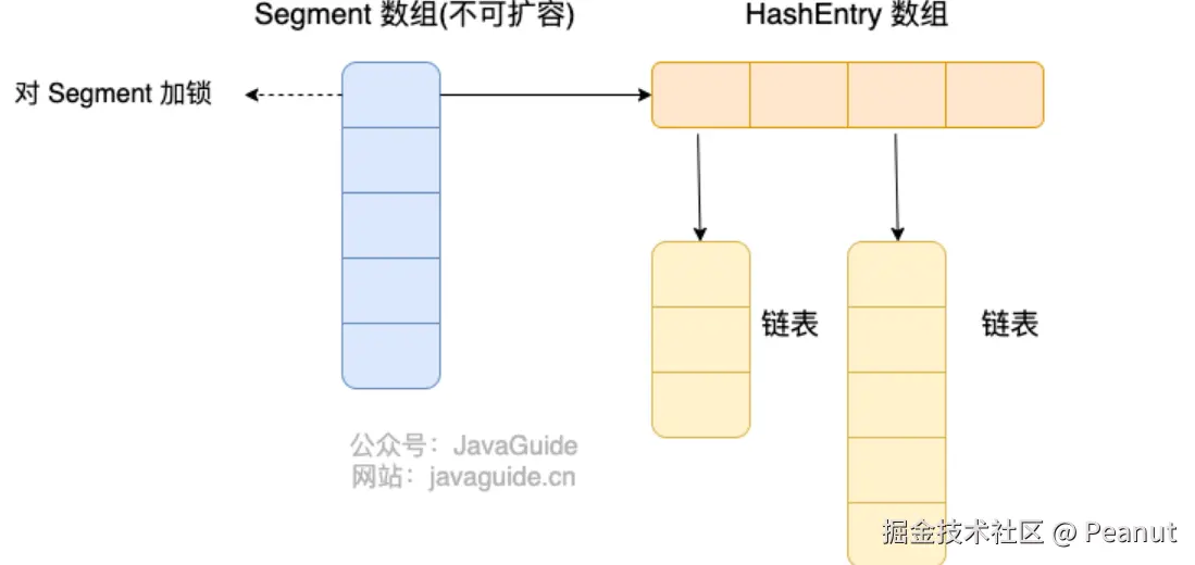 1.7及以前,对每个Segment加锁,一个Segment包含一个entry数组。