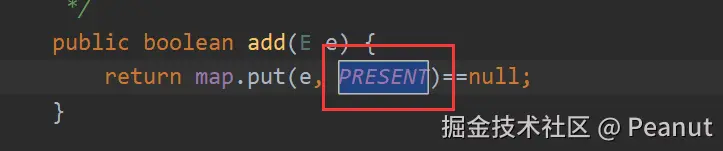 而HashSet只是在add返回的时候,告诉我们插入前是否存在元素(map.put的返回值是否为null)
