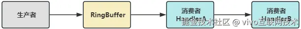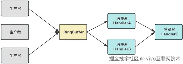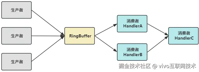 如下图,从数据流转的角度先对 Disruptor 有一个直观的概念。Disruptor 支持单(多)生产者、单(多)消费者模式。消费时支持广播消费(HandlerA 会消费处理所有消息,HandlerB 也会消费处理所有消息)、集群消费(HandlerA 和 HandlerB 各消费部分消息),HandlerA 和HandlerB 消费完成后会把消息交给 HandlerC 继续处理。