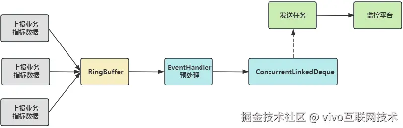 业务监控系统对于企业来说非常重要,可以帮助企业及时发现和解决问题,可以方便的检测业务指标数据,改进业务决策,从而保证业务的可持续发展。i主题使用 Disruptor(多生产者单消费者)来暂存待上报的业务指标数据,然后有定时任务不断提取数据上报到监控平台,如下图所示。