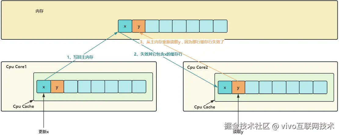 但是,这种加载带来了一个坏处,如上述例子所示,假设有一个 long 类型的变量x,另外还有一个 long 类型的变量y紧挨着它,那么当加载x时也会加载y。如果此时 CPU Core1 的线程在对x进行修改,另一个 CPU Core2 的线程却在对y进行读取。当前者修改x时,会把x和y同时加载到 CPU Core1 对应的 CPU Cache 中,更新完后x和其它所有包含x的缓存行都将失效。而当 CPU Core2 的线程读取y时,发现这个缓存行已经失效了,需要从主内存中重新加载。