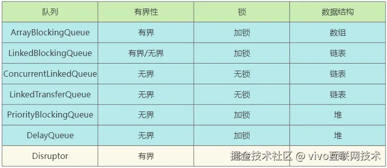 下面来看下 JDK 中内置的队列和 Disruptor 的对比。队列的底层实现一般分为三种:数组、链表和堆,其中堆一般是为了实现带有优先级特性的队列,暂不考虑。另外,像 ConcurrentLinkedQueue、LinkedTransferQueue 属于无界队列,在稳定性要求特别高的系统中,为了防止生产者速度过快,导致内存溢出,只能选择有界队列。这样 JDK 中剩下可选的线程安全的队列还有ArrayBlockingQueue 和 LinkedBlockingQueue。