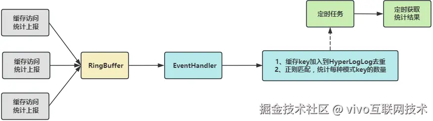 整体流程如下图所示,首先在缓存访问工具类中增加缓存访问统计上报的调用,缓存访问数据进入到 RingBuffer 后,单线程消费者使用 HyperLogLog 来去重统计不同 key的个数,使用正则匹配来统计每种模式key的数量。然后有异步任务定时获取统计结果,进行展示。
