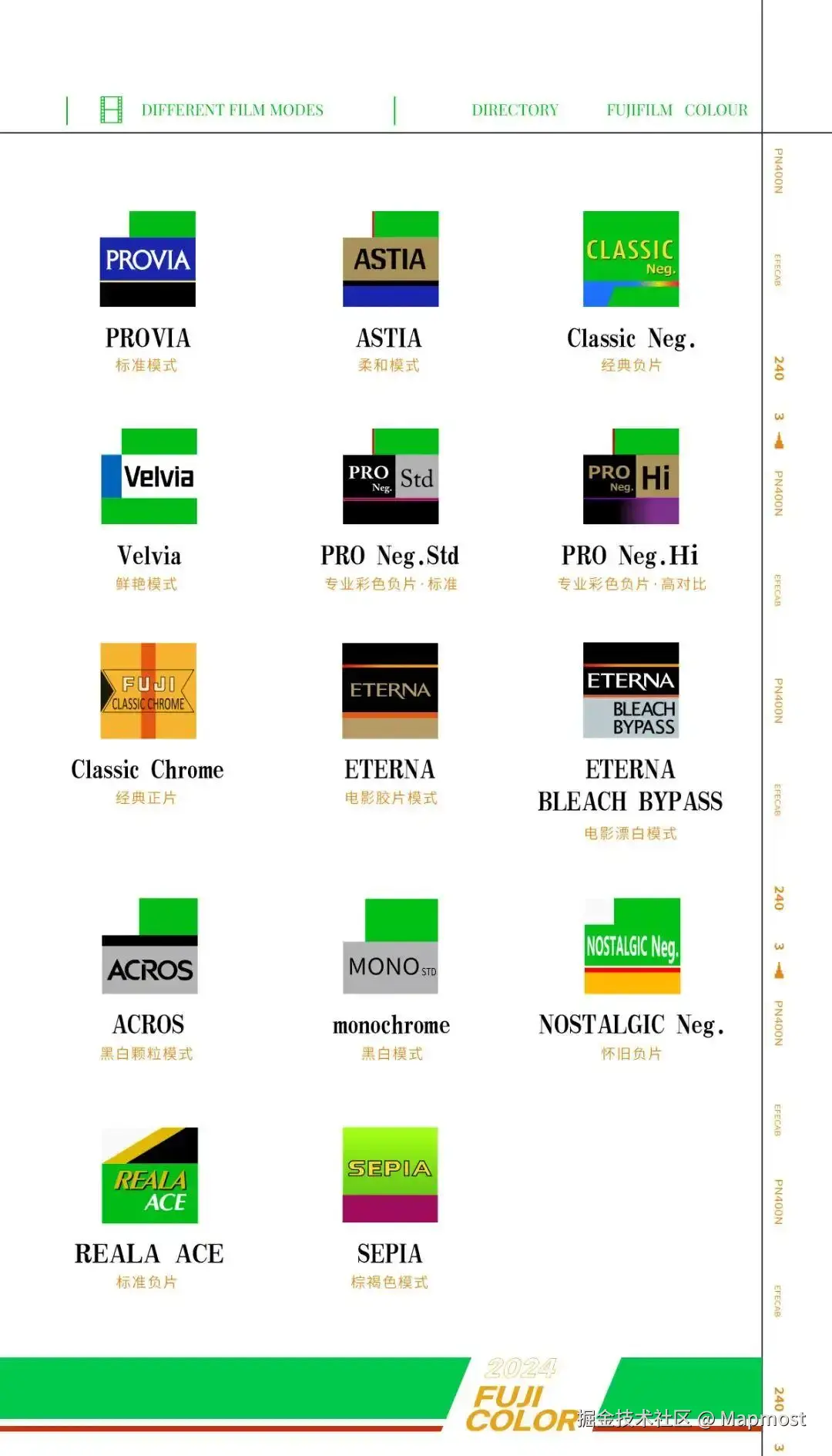 从2003年至2024年,富士共推出胶片模拟20种,分别是Provia(标准)、Velvia(鲜艳)、ASTIA(柔和)、Classic Chrome(经典)、Acros(黑白)、ETERNA(影院)、Classic Neg.(经典负)、ETERNA BLEACH BYPASS(影院漂白)、Nostalgic Negative(怀旧负)、REALA ACE(标准负)、黑白和棕褐色。