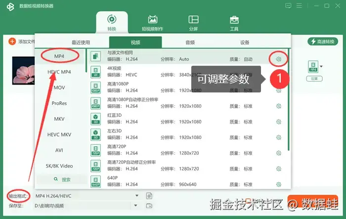 步骤二:点击软件界面左下角的 【输出格式】 按钮,随后在弹出的选项栏中,找到并选择 【mp4】 作为您的输出格式。若您有调整参数的需要,可按 【齿轮】 图标调整参数。