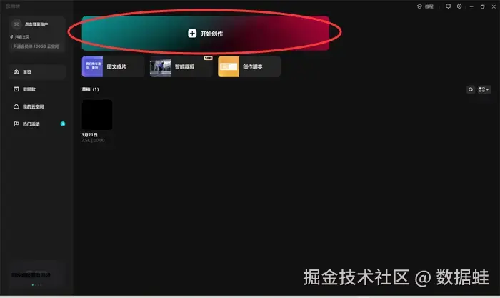 步骤一:启动剪映后,点 【+开始创作】 ,开始视频转换。