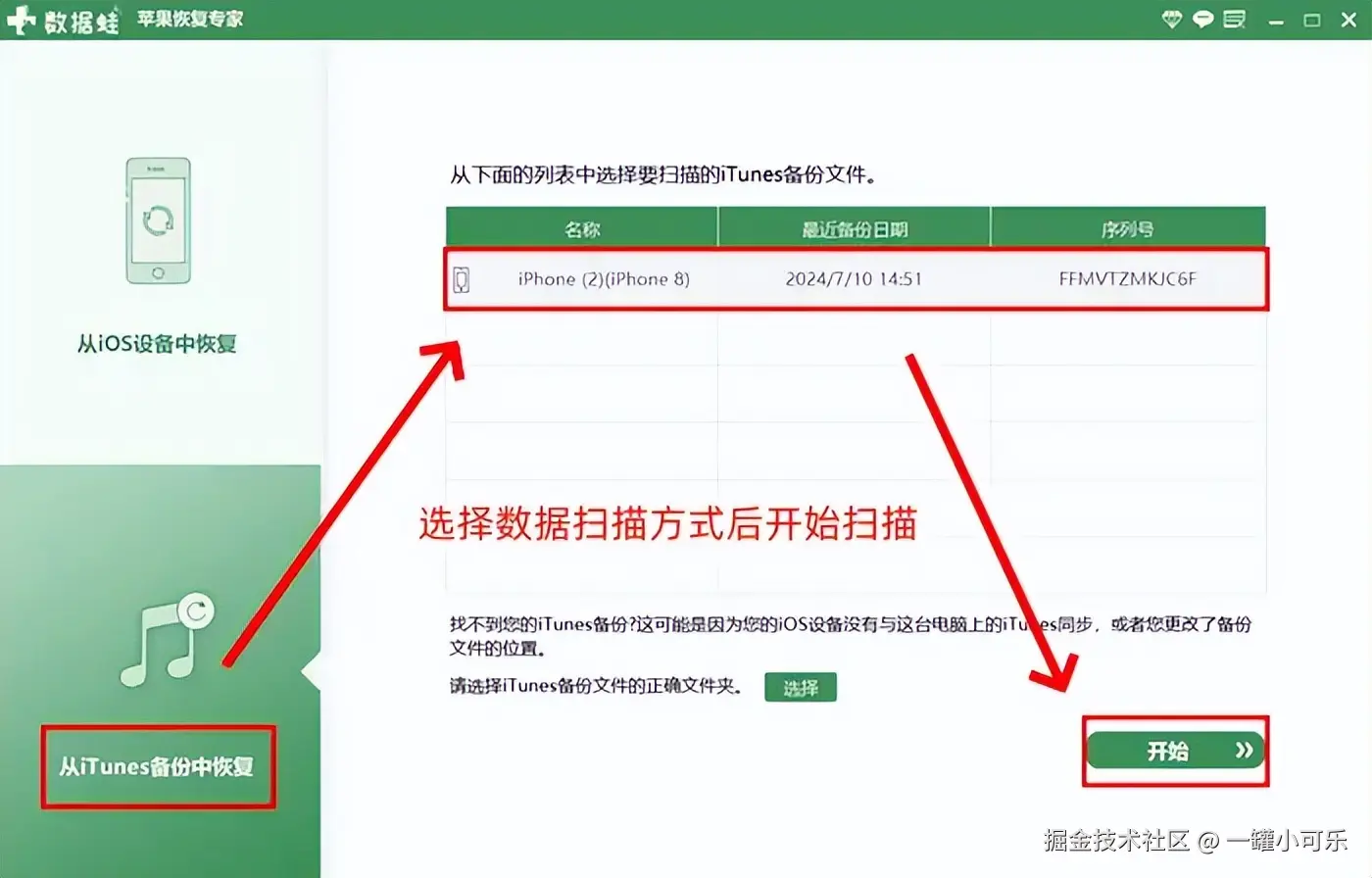 步骤2:用原装的苹果数据线连接设备和电脑,选择界面显示的其中一种数据扫描方式,然后点击 【开始】 。