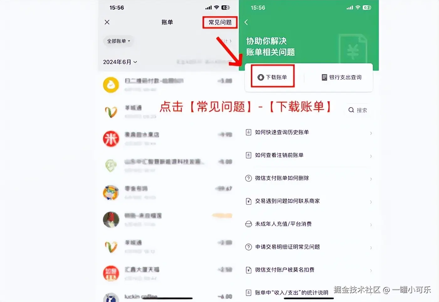 步骤2:在【账单】界面中,点击右上角的 【常见问题】-【下载账单】 ,即可找到需要的转账记录。