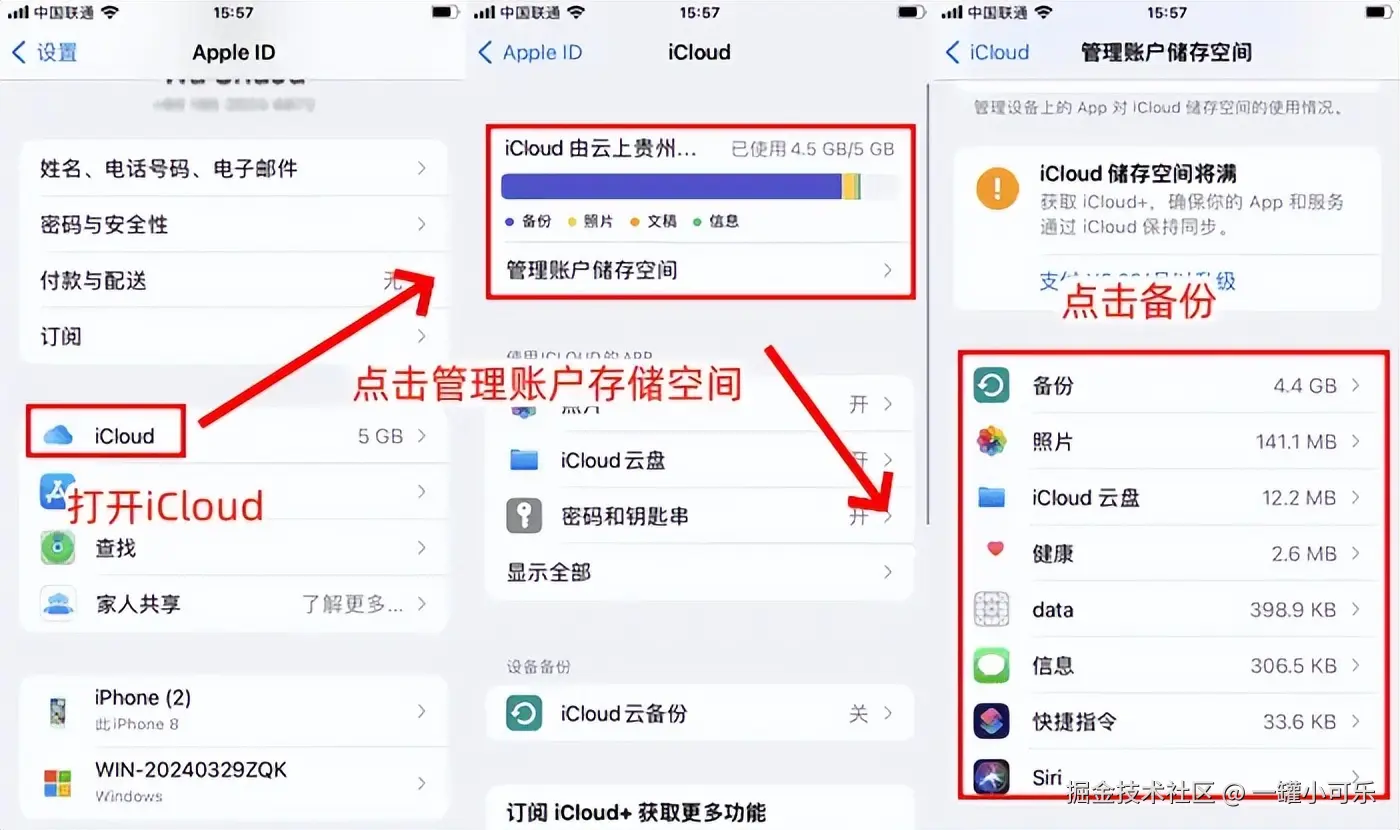 步骤1:打开手机设置应用,进入iCloud的个人主页,依次点击 【iCloud】>【管理存储】>【备份】 ,查看是否有包含微信数据的备份。
