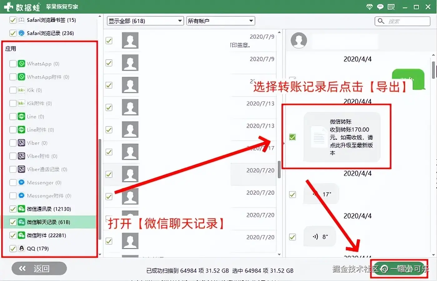 步骤4:预览完毕之后,点击 【微信聊天记录】 ,勾选需要恢复转账记录的联系人,查看显示的界面是否有需要恢复的转账记录。确认数据信息之后,点击右下角的 【导出】 就可以啦。