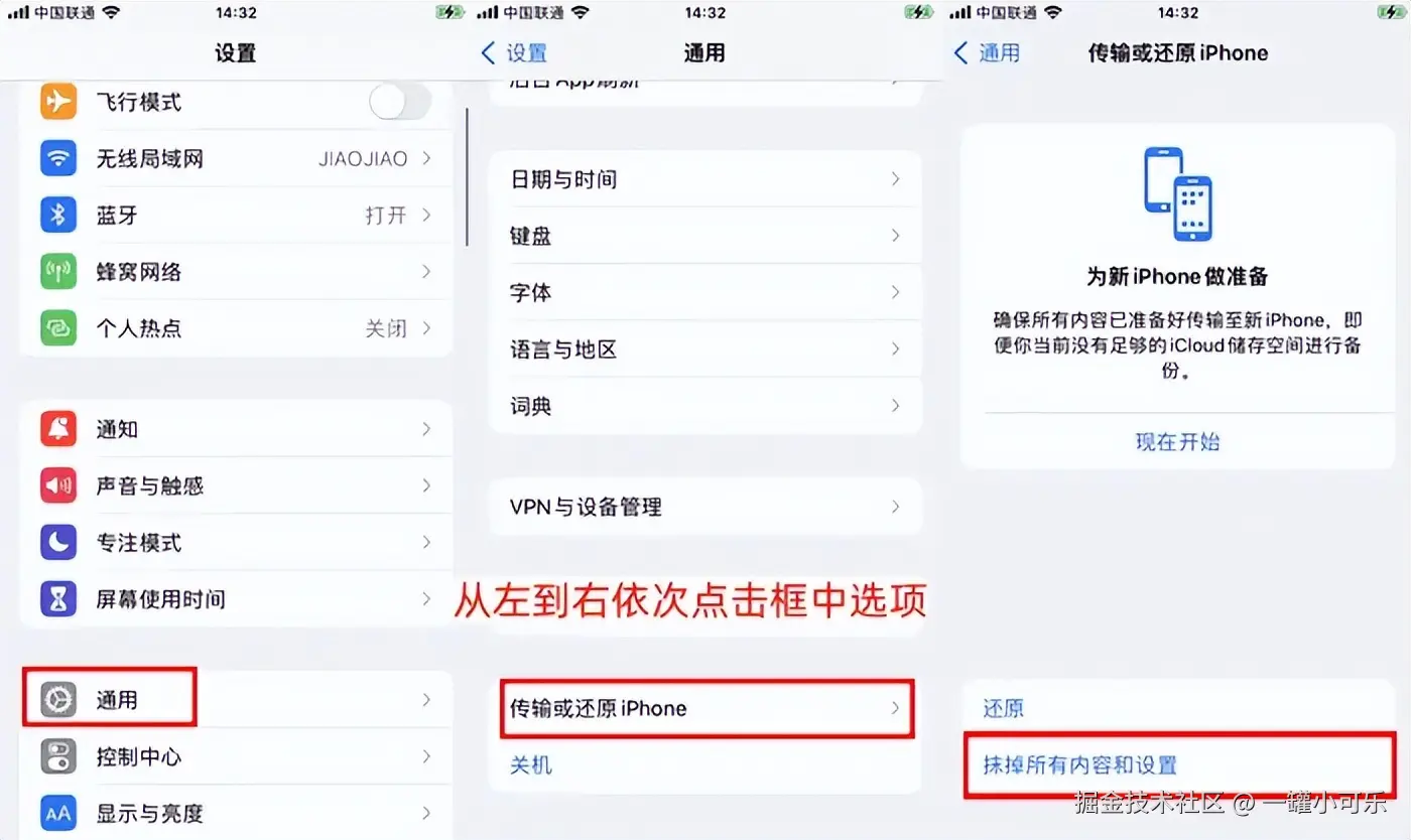 步骤2:打开微信数据的备份按钮之后,返回设置,再依次点击 【通用】>【还原】>【擦除所有内容和设置】 。