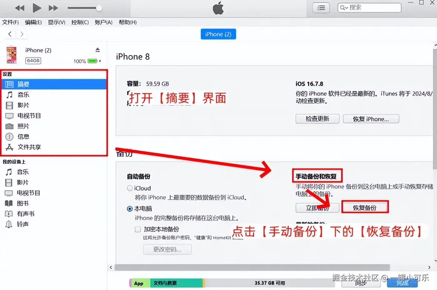 步骤2:iTunes成功识别设备之后,在 【摘要】 页面,点击 【恢复备份】 ,然后等待软件对手机数据进行扫描与备份即可。