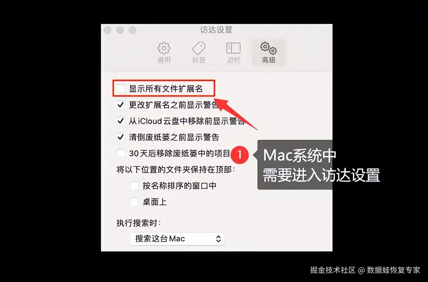 如果你使用的是Mac系统,那么情况就不一样了。在电脑上查看文件扩展名与文件格式,你需要进入 【Finder】 ,然后找到需要显示后缀名的文件夹,在下拉菜单中选择 【偏好设置】 。接下来,在新的窗口中选择 【高级】 ,并勾选 【显示所有文件扩展名】 即可。