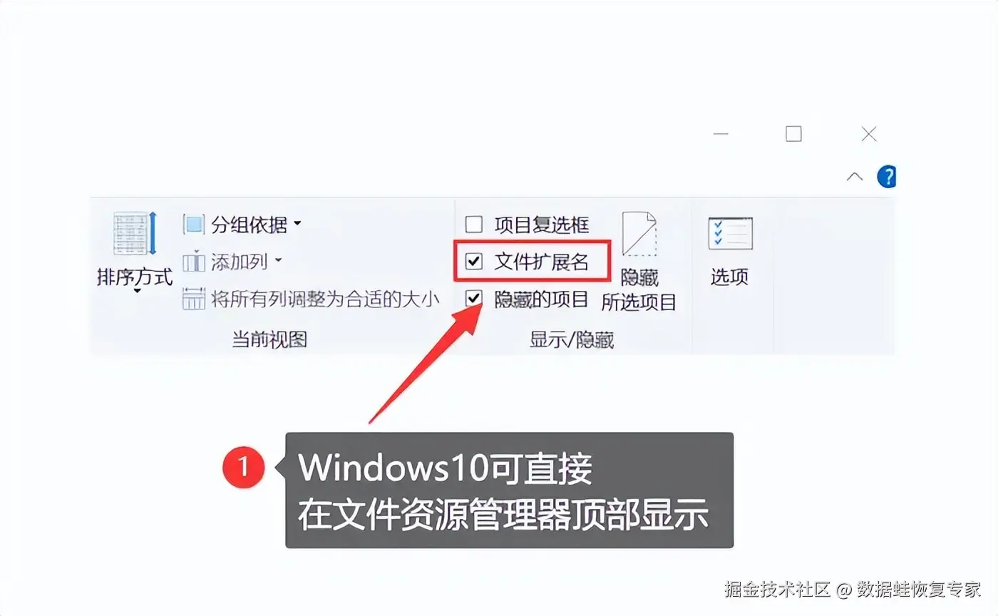 第一步:以Windows10为例,你可以直接在文件资源管理器的顶部窗口,直接找到 【文件扩展名】 ,然后勾选即可。