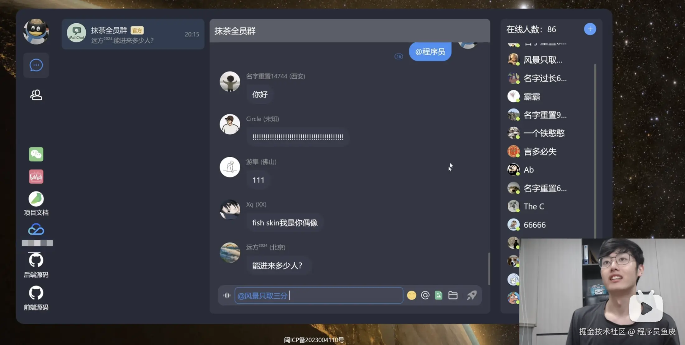 大家好,我是程序员鱼皮。上周二晚上我直播带大家学习了一个 GitHub 上不错的开源聊天室项目 MallChat ,大家表示学到了很多,所以我专门剪出了一期项目导学视频,分享给大家: www.bilibili.com/video/BV1Q1…