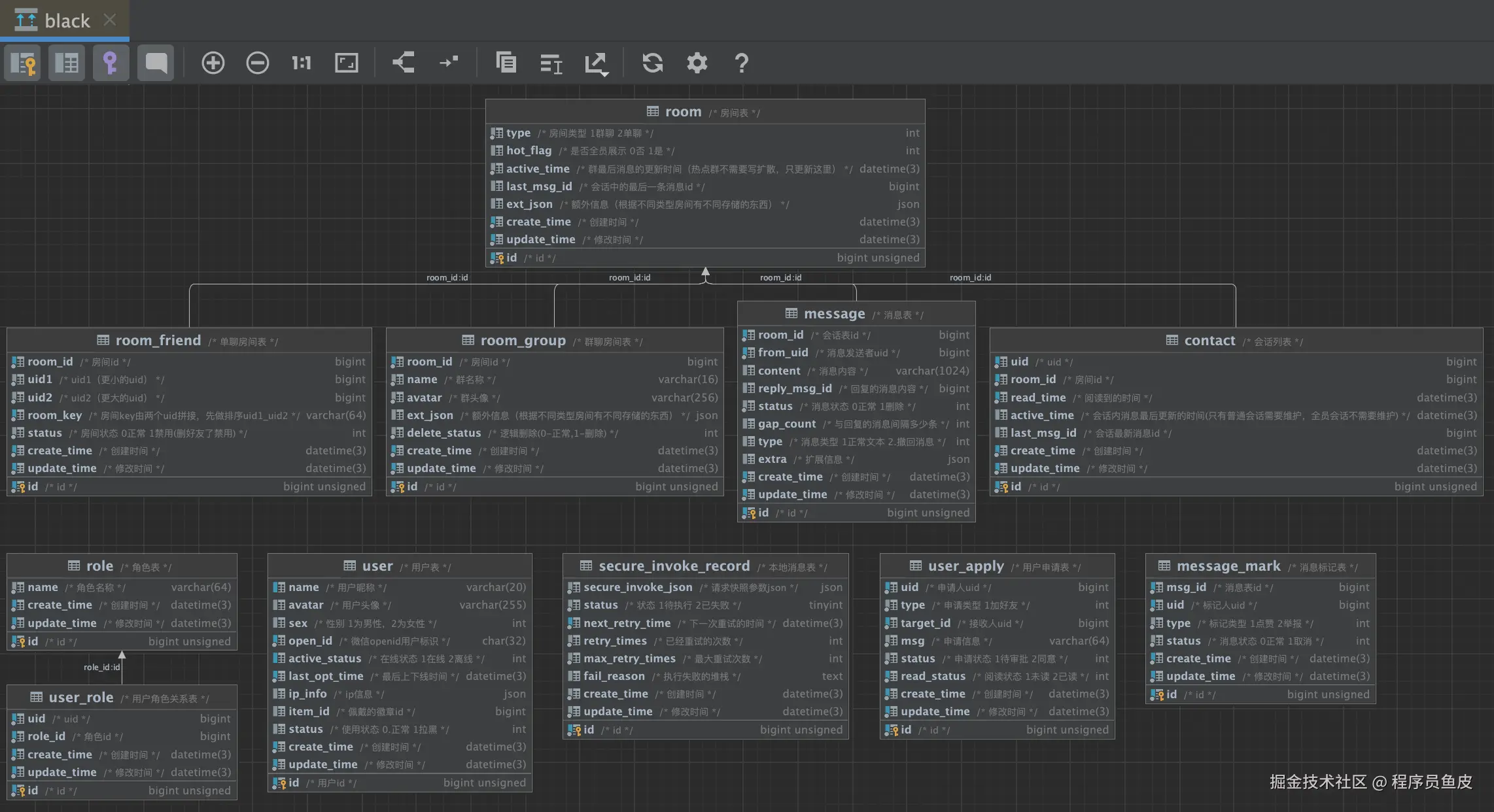 如图,表之间的关系一目了然!比如房间又分为单聊和群聊,一个房间内有多个会话和消息: