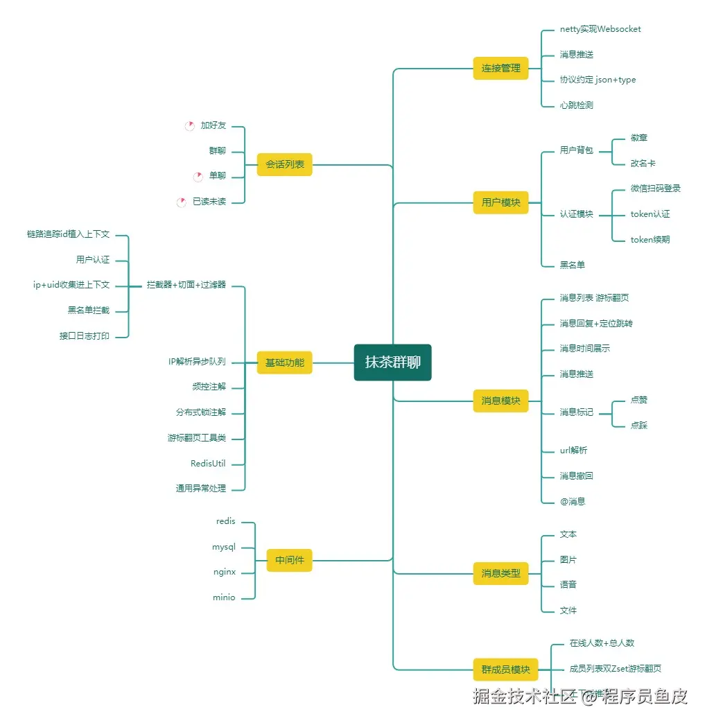 以 MallChat 聊天室为例:github.com/zongzibinbi… ,项目介绍文档中包含对核心功能的介绍,可以看看有没有自己感兴趣的功能: