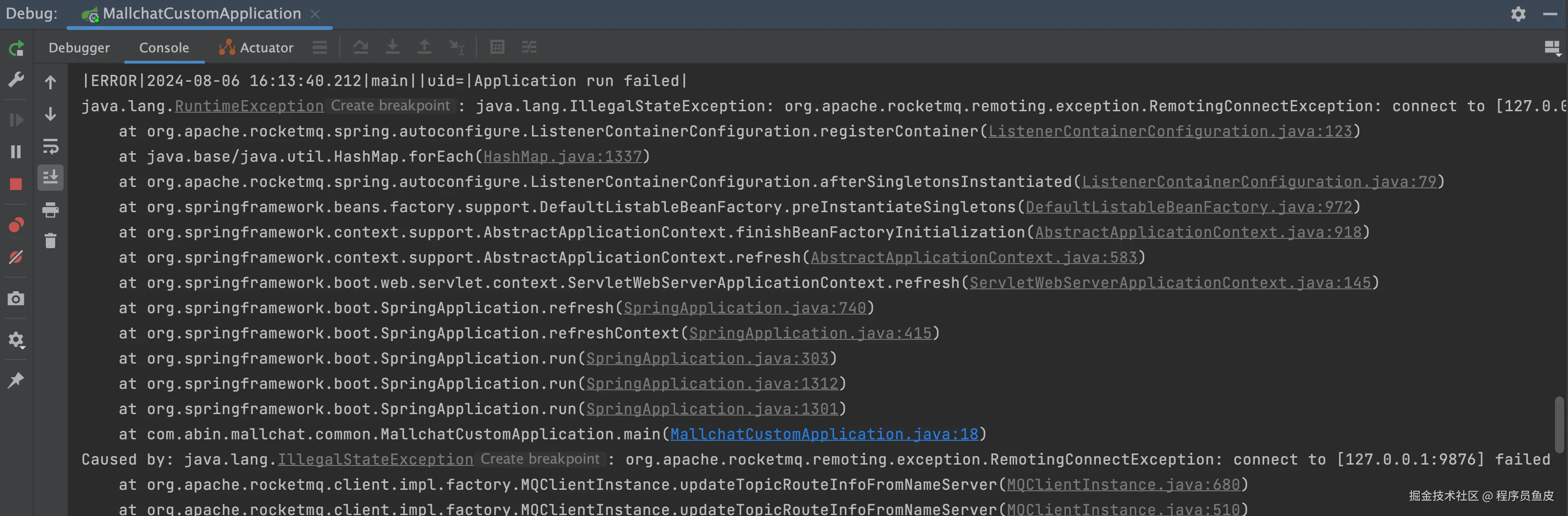 这里分享一个常用的快速运行项目的技巧。有的时候项目用到了很多依赖(比如 MallChat 中用了 MinIO、RocketMQ 等),但是我们本地并没有安装这些依赖,导致项目无法启动。如下图,因为我没安装 RocketMQ,导致启动时连接 RocketMQ 报错: