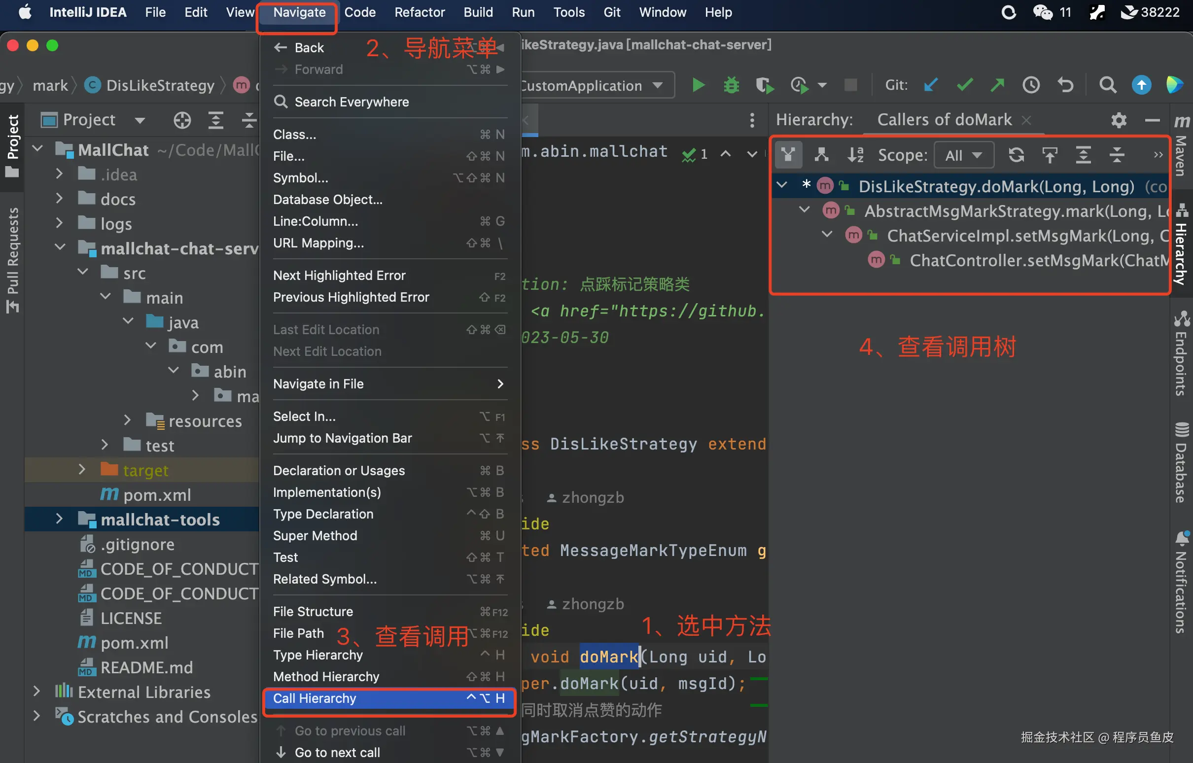 3)可以通过 Call Hierarchy 功能查看方法、类或变量在程序中被调用的层次结构和关系。比如下图我查看了 doMark 方法的调用者视图,可以看到哪些方法调用了它,便于快速理解代码之间的交互,不用自己一层一层点进去看了。