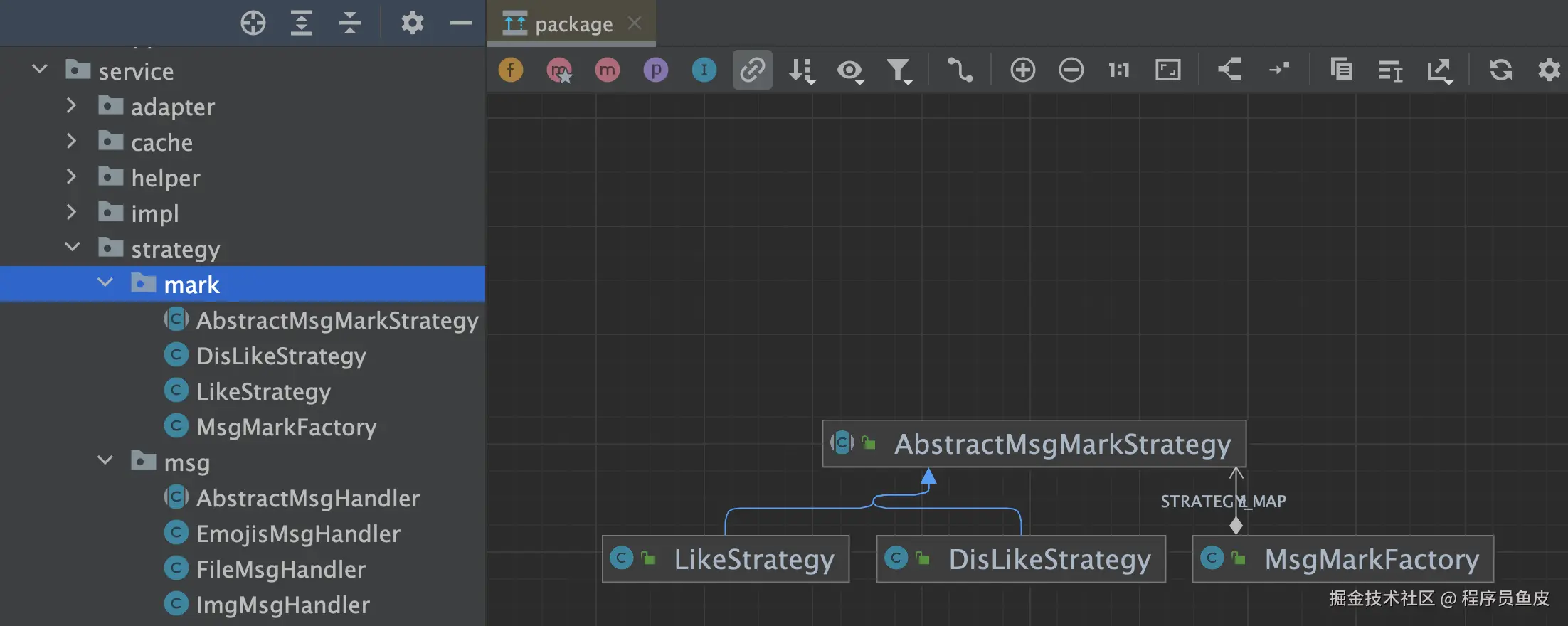 通过结构图,我们可以速览类之间的关系。比如下图中,工厂创建策略、两个具体策略继承了抽象策略类: