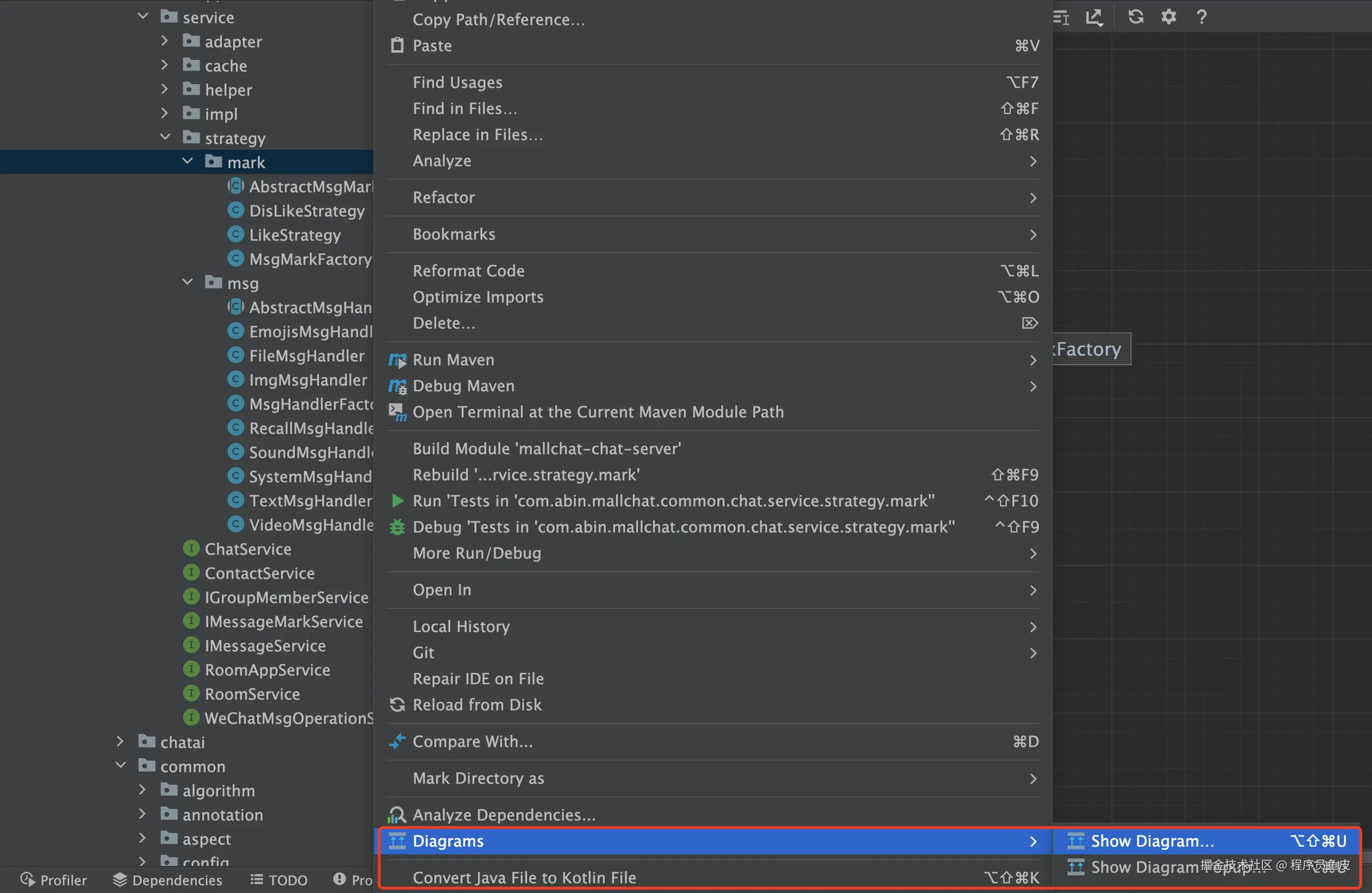 查看某个目录内部的文件组织形式时,有一个小技巧。可以直接在 IDEA 中右键点击某个包,查看 UML 结构图: