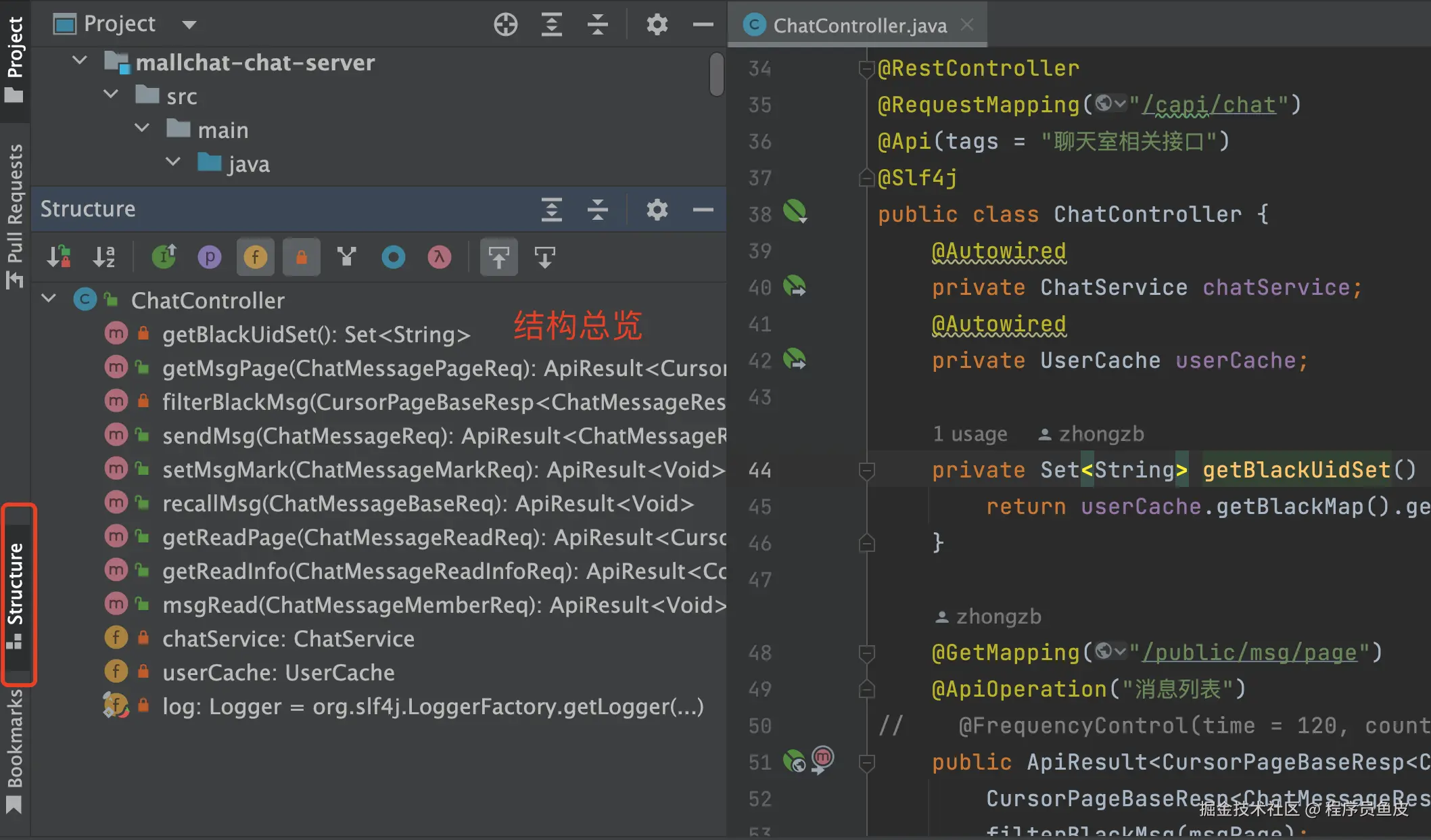 2)如果想快速了解单个文件的核心结构(比如方法和属性),可以使用 IDEA 的 Structure 功能,如图: