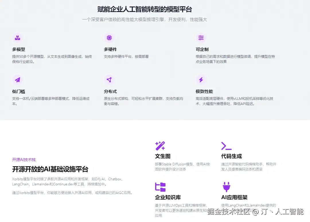 模型推理:大语言模型,语音识别模型,多模态模型的部署流程被大大简化。一个命令即可完成模型的部署工作。前沿模型:框架内置众多中英文的前沿大语言模型,包括 baichuan,chatglm2 等,一键即可体验!内置模型列表还在快速更新中!异构硬件:通过 ggml,同时使用你的 GPU 与 CPU 进行推理,降低延迟,提高吞吐!接口调用:提供多种使用模型的接口,包括 OpenAI 兼容的 RESTful API(包括 Function Calling),RPC,命令行,web UI 等等。方便模型的管理与交互。集群计算,分布协同: 支持分布式部署,通过内置的资源调度器,让不同大小的模型按需调度到不同机器,充分使用集群资源。开放生态,无缝对接: 与流行的三方库无缝对接,包括 LangChain,LlamaIndex,Dify、FastGPT、RAGFlow、Chatbox。