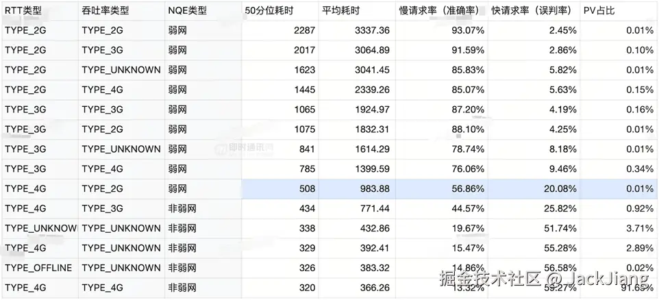 - 2) 判断弱网-慢请求率:在判断为弱网的前提下,实际上慢请求的比例。慢请求指上文中的实际弱网,即高于50分位耗时+网络传播耗时;