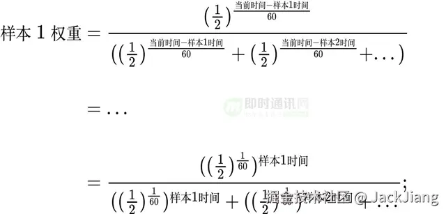 - 2) 对于时间,通过单个请求的时间权重公式(图4),我们可以推导出多个样本时,单个样本的权重不会随当前时间发生变化(图8),也就是我们无需考虑时间流逝对时间权重的计算影响。