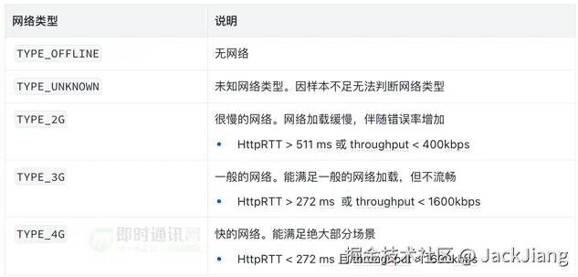 即使用户连接的是5G网络,当其因信号不好等其他因素导致RTT较高或throughput较低时,也会被划分到TYPE_2G。换句话说,这里用TYPE_2G就是表明网络很慢,就和很多年前的2G一样慢。
