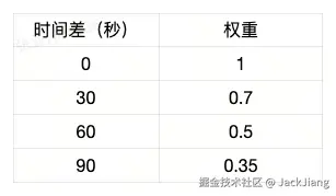 60秒半衰期下不同时间差下的权重: