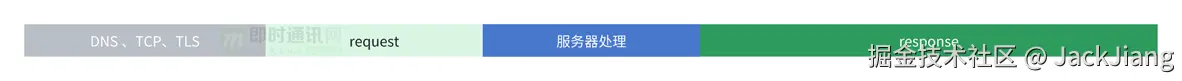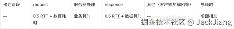 - 3) 网络传播耗时 = request + response = RTT + 数据发送耗时。