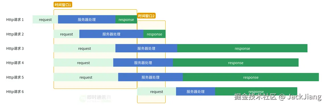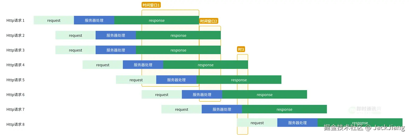 可以看出,当并发较多时,服务器耗时会被覆盖,每个时间窗口内存在约4个Http请求的响应数据。